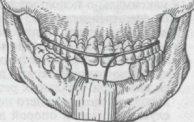 Рис. 247. Формирующий аппарат (по А.И.Бетельману). Фиксирующая часть укреплена на верхних зубах, а формирующая часть расположена между фрагментами нижней челюсти.