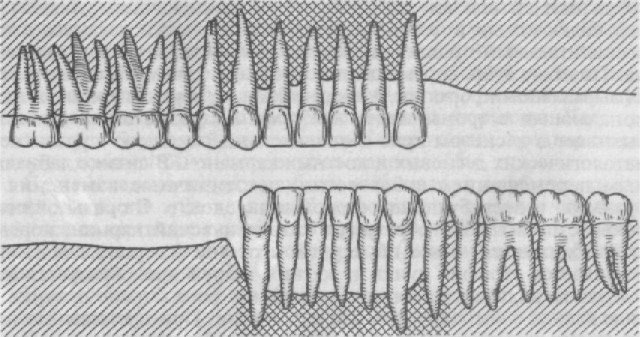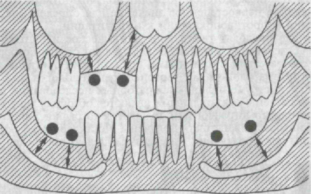 При недостаточности физиологических резервов пародонта, что наблюдается при значительном поражении зубных рядов, для опоры протезов и аппаратов используются беззубые альвеолярные отростки челюсти и твердое небо.