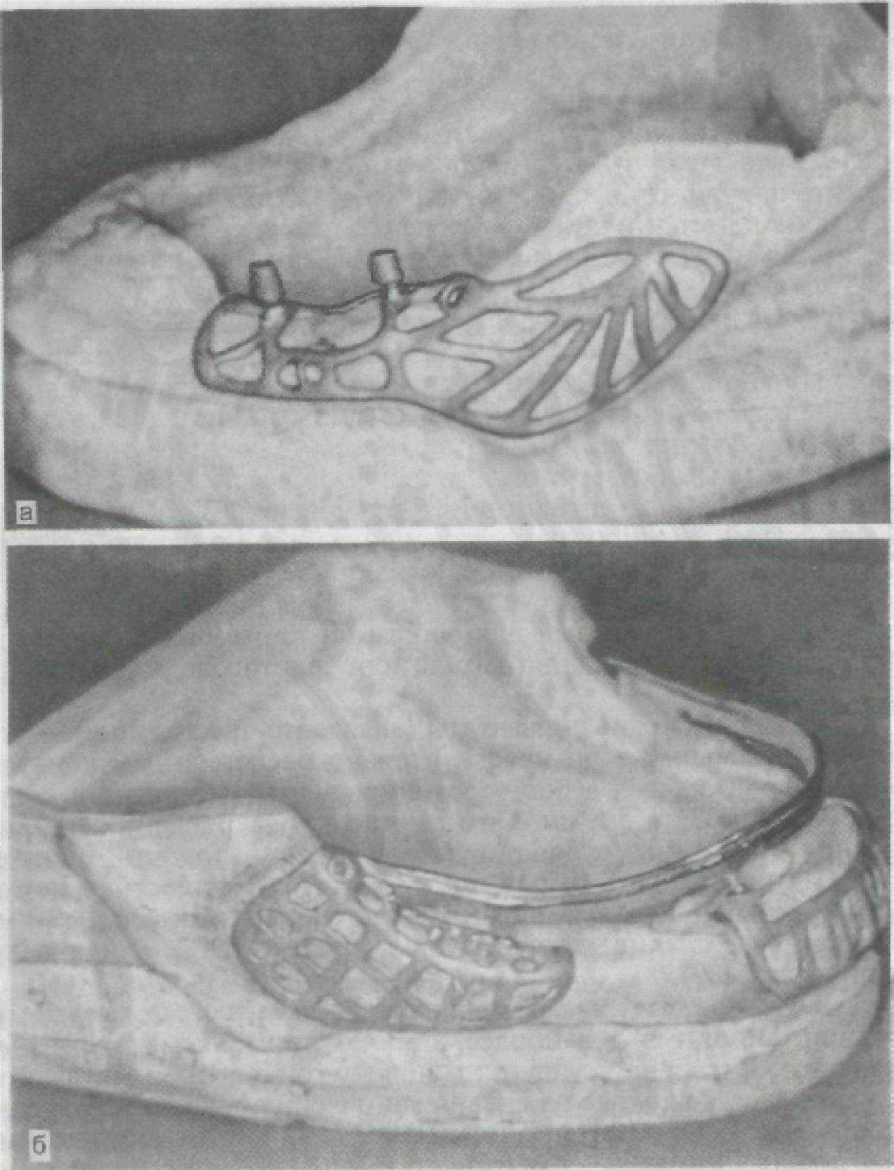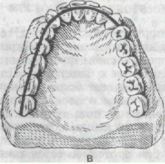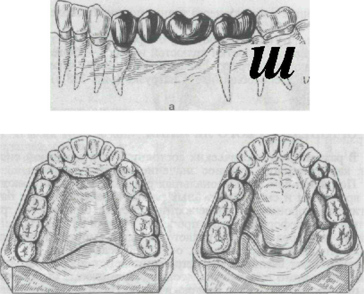 Вторая группа — протезы, опирающиеся на беззубые альвеолярные отростки челюстей и небо, — пластиночные протезы, передающие нагрузку через ткани, не приспособленные к нагрузке (рис. 298,6).