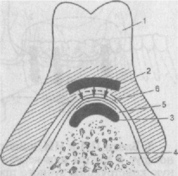 При всей сложности структурных связей окружающих тканей с имплантатом (инородным телом) эта связующая система остается лишь биотехнической имитацией натурального соединения тканей пародонта с естественным зубом.