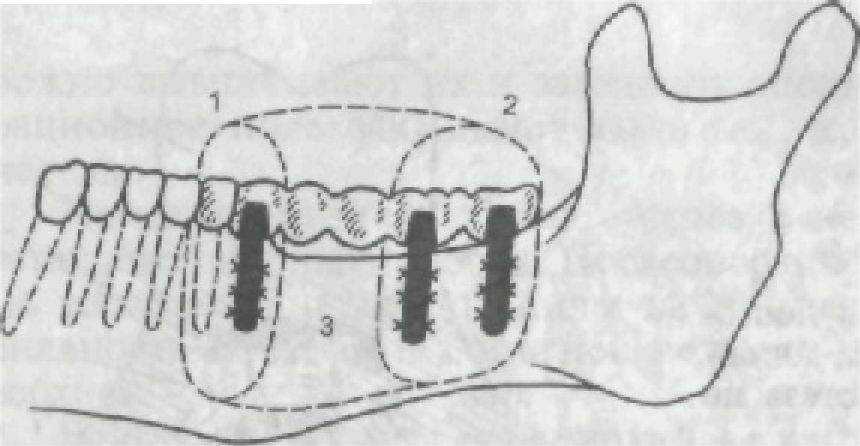 (рис. 274). В дальнейшем необходимо изготовить шаблоны будущих протезов, которые позволят точно определить количество и место расположения имплантатов, смоделировать окклюзионные контакты. С помощью этих шаблонов выбирают ортопедическую конструкцию и определяют количество опор. Для точного определения толщины альвеолярного отростка в месте предполагае -