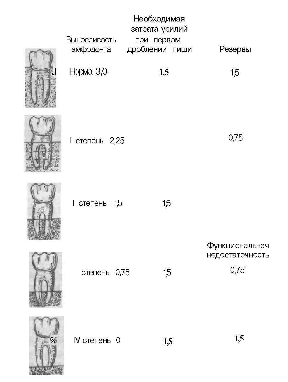 пародонта зуба к нагрузке, со средними усилиями, необходимыми для первого дробления пищи, можно сделать вывод, что пародонт отдельного зуба обладает запасом резервных сил, по меньшей мере равным усилиям, затрачиваемым для размельчения пищи в физиологических условиях. Подобно тому как одна почка, одно легкое может работать с двойной нагрузкой, пародонт одного зуба может вынести нагрузку, приходящуюся на два зуба.