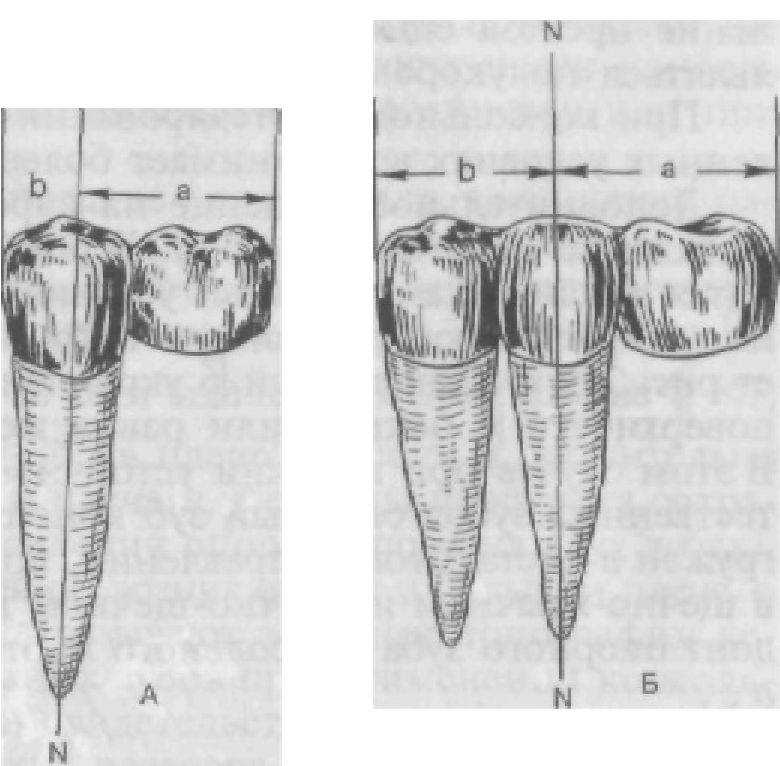 Несколько иные механические условия для восприятия пародонтом нагрузки возникают в том случае, если опорные зубы расположены с промежутком. В приводимом примере нагрузка, падающая на плечо а (по отношению к оси N—N опорного [5),.