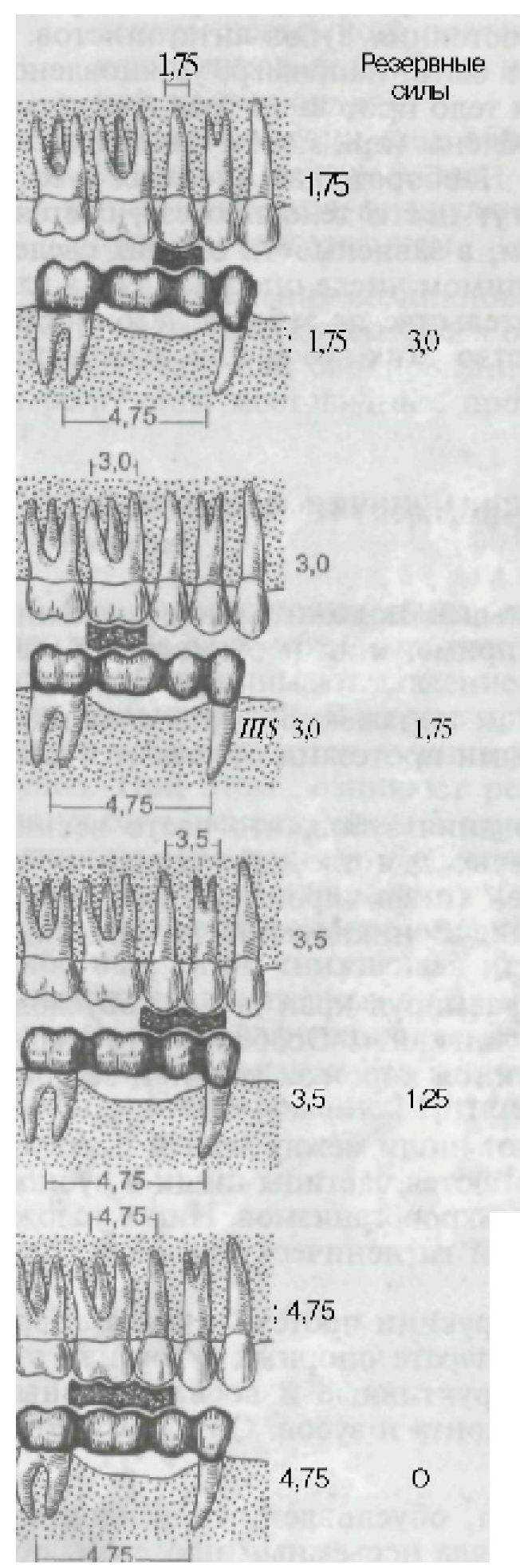 Еще лучше, если пародонт опорных зубов контрольного протеза способен вынести большую нагрузку, чем та, которая необходима для первого дробления пищи на конце консоли, т.е.