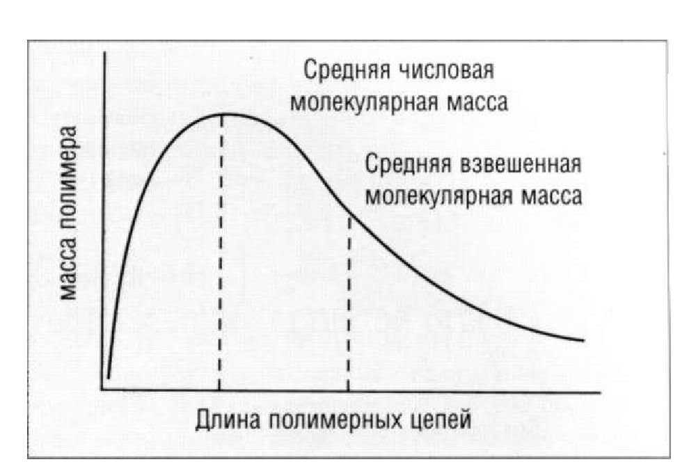 Молекулярная масса полимера равна числу повторяющихся элементарных звеньев (т.е. степени полимеризации), умноженному на молекулярную массу элементарного звена. Как при аддитивной, так и при конденсационной полимеризации,длина цепи определяется чисто случайными факторами, поэтому не все цепи будут иметь одинаковую длину, то есть, в веществе будут присутствовать цепи с разными длинами. Таким образом, молекулярная масса может быть представлена только усредненным значением.