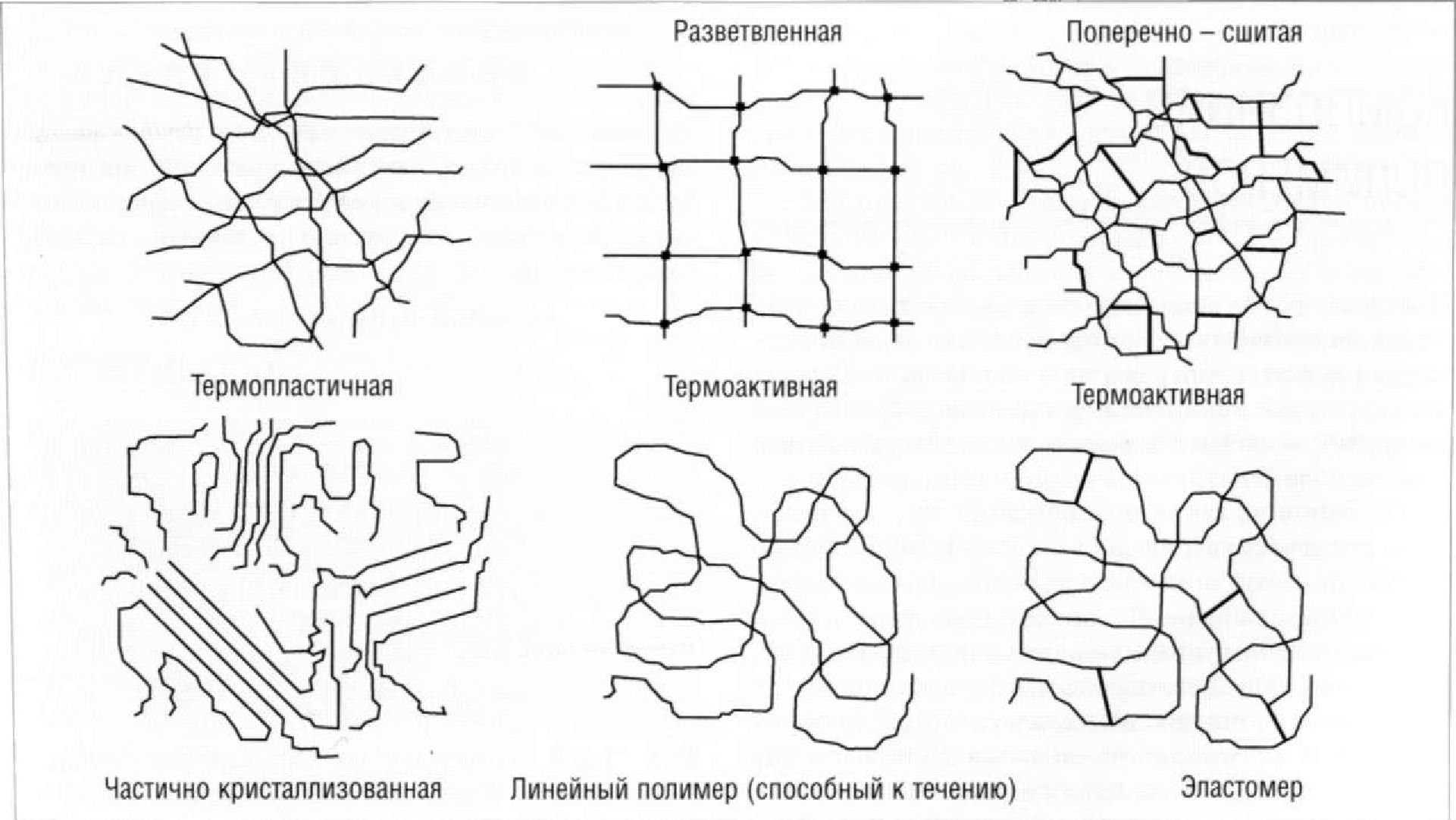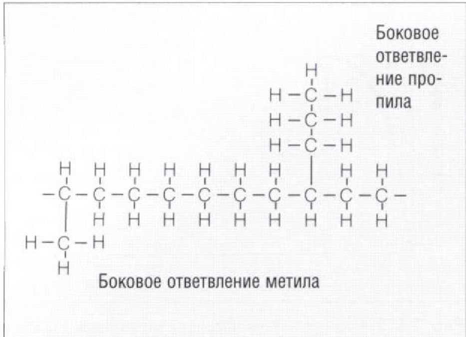 У многих полимеров цепи макромолекул не имеют такого линейного строения, как у полиэтилена. К тому же и полиэтилен, цепи молекул которого фактически построены из метильных групп, на самом деле имеет нелинейное строение, поскольку в процессе полимеризации могут возникнуть разветвления цепи (Рис. 1.6.6). Эти разветвления делают структуру полимера объемной, что препятствует свободному перемещению цепей относительно друг друга даже при нагревании материала, следовательно, полиэтилен может сохранять свои свойства при достаточно высокой температуре, до тех пор, пока не произойдет химическое разрушение структуры полимера.