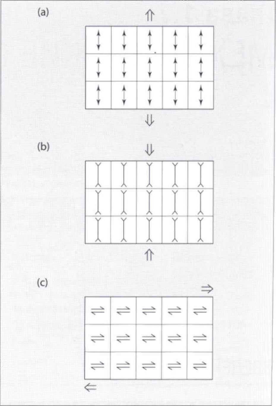 Рис. 1.7.2. Три основные вида напряжений: (а) растяжения; (Ь) сжатия; (с) сдвига
