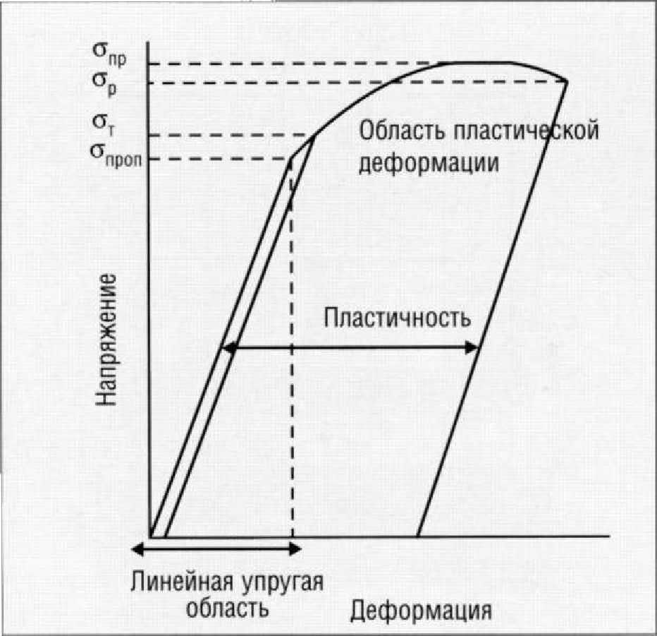 Типичная кривая напряжение — деформация для металла, подобного латуни (сплаву меди с цинком), представлена на Рис. 1.7.3. Эта кривая может быть использована для оценки некоторых свойств материала.
