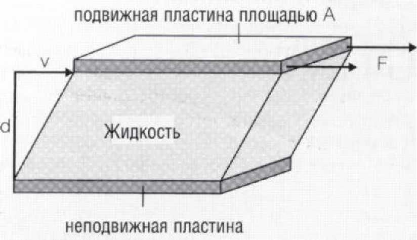 Рис. 1.8.1. Сдвиг слоя жидкости толщиной d, расположенного между двумя твердыми пластинами. Для движения верхней подвижной пластины относительно неподвижной нижней со скоростью V необходимо приложить силу F для преодоления сопротивления данного слоя жидкости