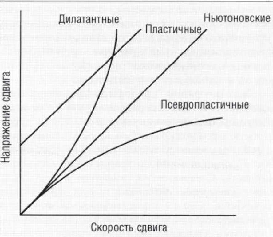Рис. 1.8.3. Графическое представление реологических свойств ряда жидкостей