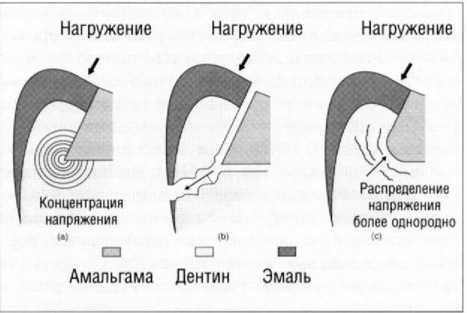 Чем больше удаляют тканей зуба, тем слабее он становится. Амальгама действует как эффективный восстановительный материал утраченных тканей зуба, но, не обладая адгезивными свойствами, она не способствует укреплению структуры зуба. Поэтому всегда следует применять щадящие методики, путем минимального препарирования тканей зуба.