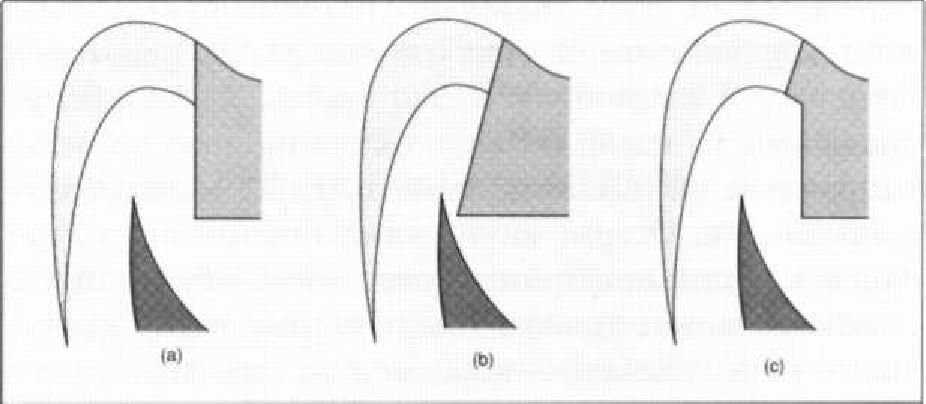 Рисунок 2.1.8 Тупой угол полость-поверхность(а) дает острый угол у края пломбы, что приведет к перелому края, и поэтому он должен быть скорректирован, Ha (Ь) угол полость-поверхность более близок к идеальному, но это может привести к перфорации пульпы, Приемлемая ситуация приведена на (с), где корректировка ограничена эмалью без увеличения общего размера полости,