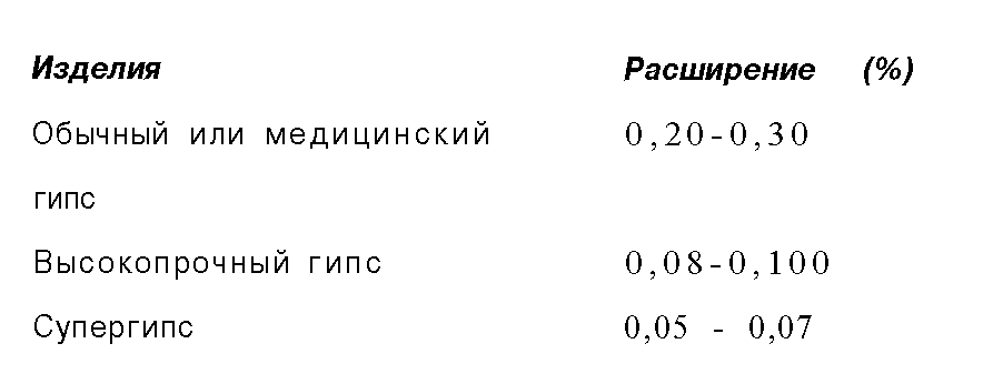 Таким образом, тщательно регулируя количество вышеуказанных добавок, можно получать гипсовые материалы с необходимой степенью расширения, rot ным рабочим временем и временем затвердевания, которые соответствуют различным видам назначения. Показатели расширения при затвердевании для гипсов приведены в Таблице 3.1.2.