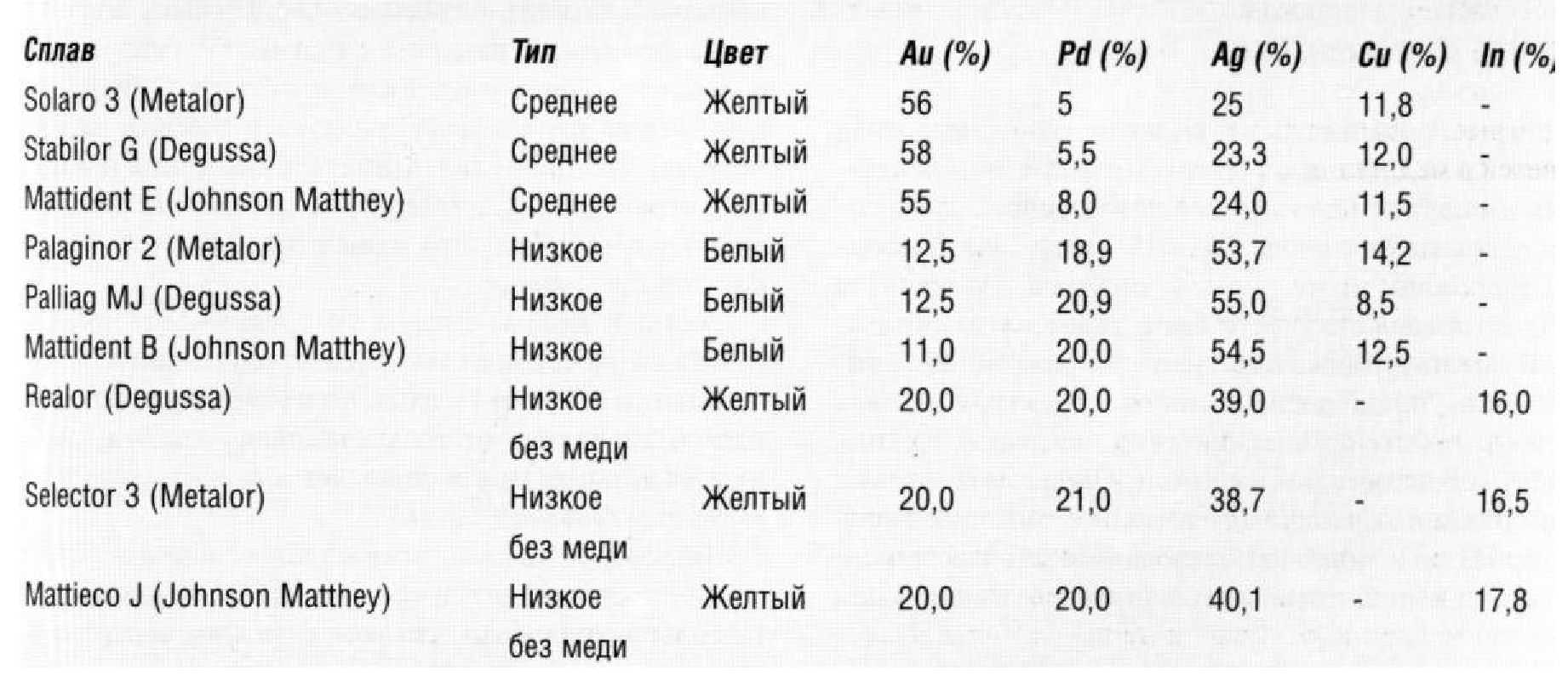 более слабыми механическими свойствами, чем сплавы со средним содержанием, и рекомендуются в качестве альтернативы сплавам золота III и IV типов. СЬ нако стальной цвет сплавов снижает на них спрос пациентов. Эти сплавы часто применяются для изготовления литых штифтов и основ, где стальной цвет сплава не мешает, поскольку отливка покрывается другим материалом.