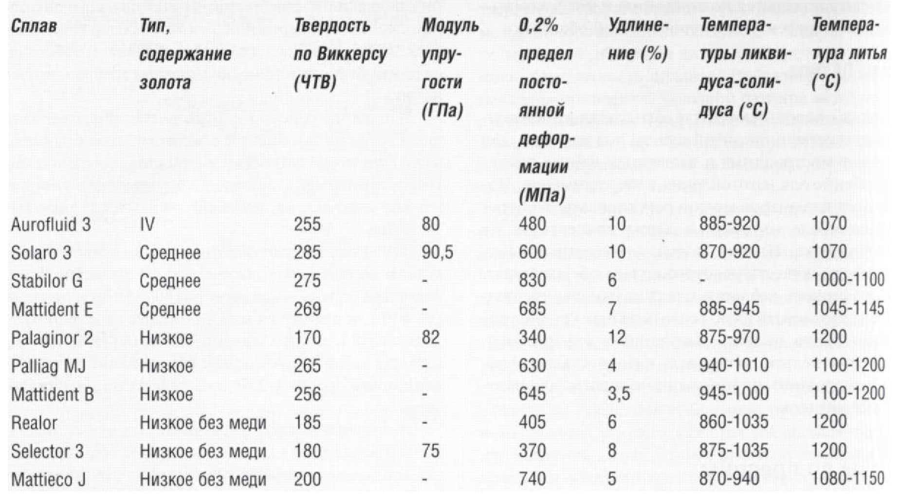 Хотя, в целом, сплавы со средним содержанием золота являются подходящей альтернативой золотосодержащим сплавам IV типа, но их свойства нестабильны и изменяются от сплава к сплаву, что отличает их от всех четырех типов сплавов с высоким содержанием золота (Таблица 3.3.4).