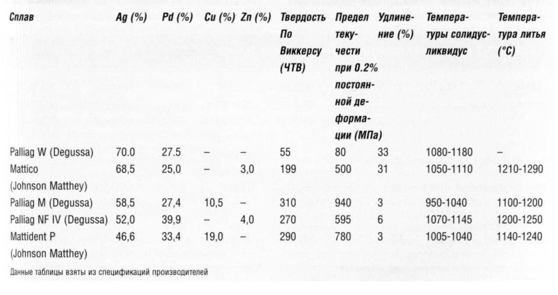 Существует также некоторое количество сплавов с низким содержанием золота (от 10 до 20%). Другие элементы сплава — это серебро (40 — 60%) и палладий (до 40%), и потому их можно назвать серебряно-палладиевыми (Ag-Pd) сплавами, но мы оставим этот термин для обозначения сплавов с незначительным содержанием золота ( 2%) или совсем не содержащих золота.