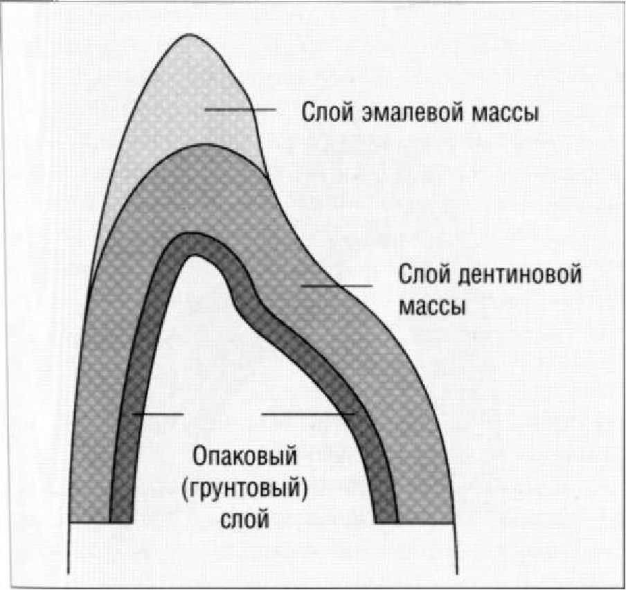 Опаковый (грунтовый) слой наносят на металлический каркас первым, поэтому в состав опаковой керамики вводят большее количество оксидов металлов, чтобы сделать ее непрозрачной и замаскировать темный цвет оксидной пленки на поверхности металлического каркаса.