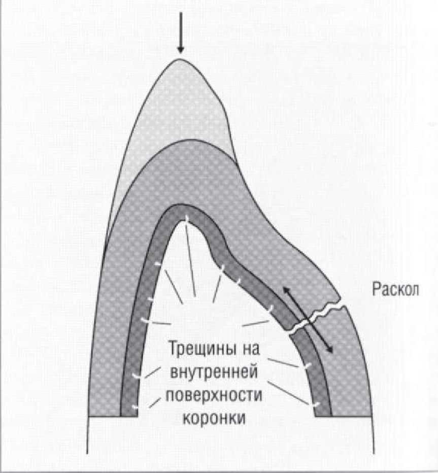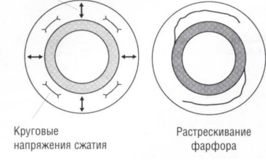 Хотя стоматологический фарфор обладает достаточно высокой прочностью при сжатии (350 — 550 МПа), прочность при растяжении является очень низкой (20 — 60 МПа), что является типичным свойством хрупких твердых веществ. Материал, состоящий в основном из стекла, отличается отсутствием области вязкого разрушения (повышенной хрупкостью). Максимальная деформация, которую способно выдержать стекло без разрушения, составляет менее 0,1%. Стекла чрезвычайно чувствительны к появлению в них поверхностных микротрещин, и это препятствует широкому использованию стоматологического фарфора. При охлаждении коронки, нагретой до температуры обжига, наружные слои фарфора остывают быстрее, чем внутренние, в частности из-за того, что фарфор обладает низкой теплопроводностью. Вначале наружная поверхность коронки сжимается быстрее, чем внутренняя, что приводит к развитию напряжений сжатия на наружной поверхности. При этом, внутренняя поверхность будет находиться под действием остаточных напряжений растяжения, поскольку ее сжатию будет препятствовать наружный слой.