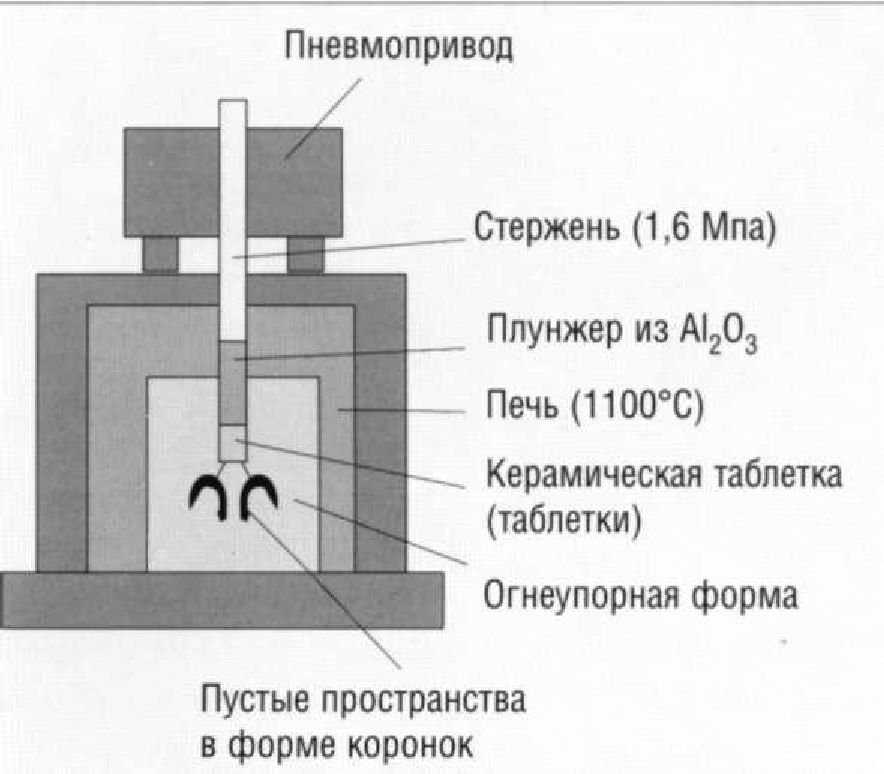 Сначала коронки медленно прогревают перед входом в печь. Это делают для того, чтобы удалить избыток влаги до того, как она обратится в пар. Если влага, содержащаяся в керамической массе, обратится в пар в самой печи, это может привести к разрушению хрупкого сырого изделия, поскольку пар будет стремительно выходить из материала. После подсушивания уплотненной массы коронку помещают в печь, где происходит выгорание связующего вещества. На этом этапе происходит некоторое уплотнение материала.