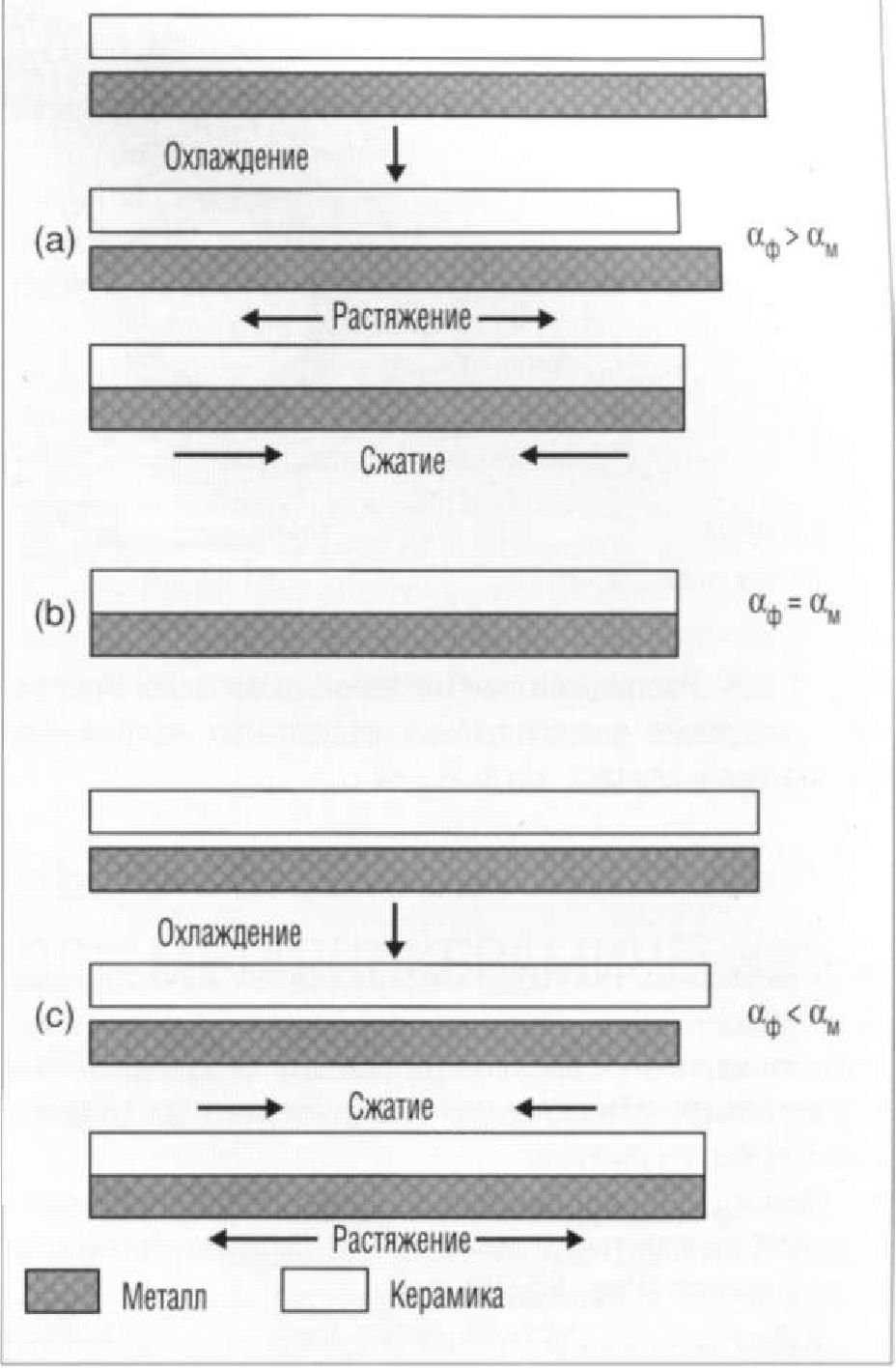 дящейся в пределах от 600°С до 700°С. С момента утраты керамикой термопластической текучести, любое расхождение по коэффициентам термического расширения между покрытием и металлом приведет к образованию напряжений в керамике, поскольку она будет стремиться к большему или меньшему сжатию, чем металл, в зависимости оттого, каким будет характер термической несогласованности между ними. В данном случае можно рассмотреть три возможных ситуации:.