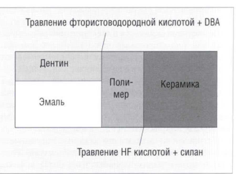 наносится адгезив, при этом образуется переходный слой поверхности раздела с более высокой прочностью при разрушении. Для керамики это особенно важно, т.к. характеристики керамики под действием нагрузок в значительной степени зависят от прочности соединения со структурой зуба. Для обеспечения прочного химического соединения между полимерным композитным материалом для фиксации и керамикой применяется специальное связывающее вещество — аппрет. А это значит, что соединение полимерного материала с керамикой основано на результате травления керамики кислотой, которое создает микромеханическую ретенционную поверхность для аппрета, и на образовании химической адгезионной связи аппрета с протравленной поверхностью керамики.