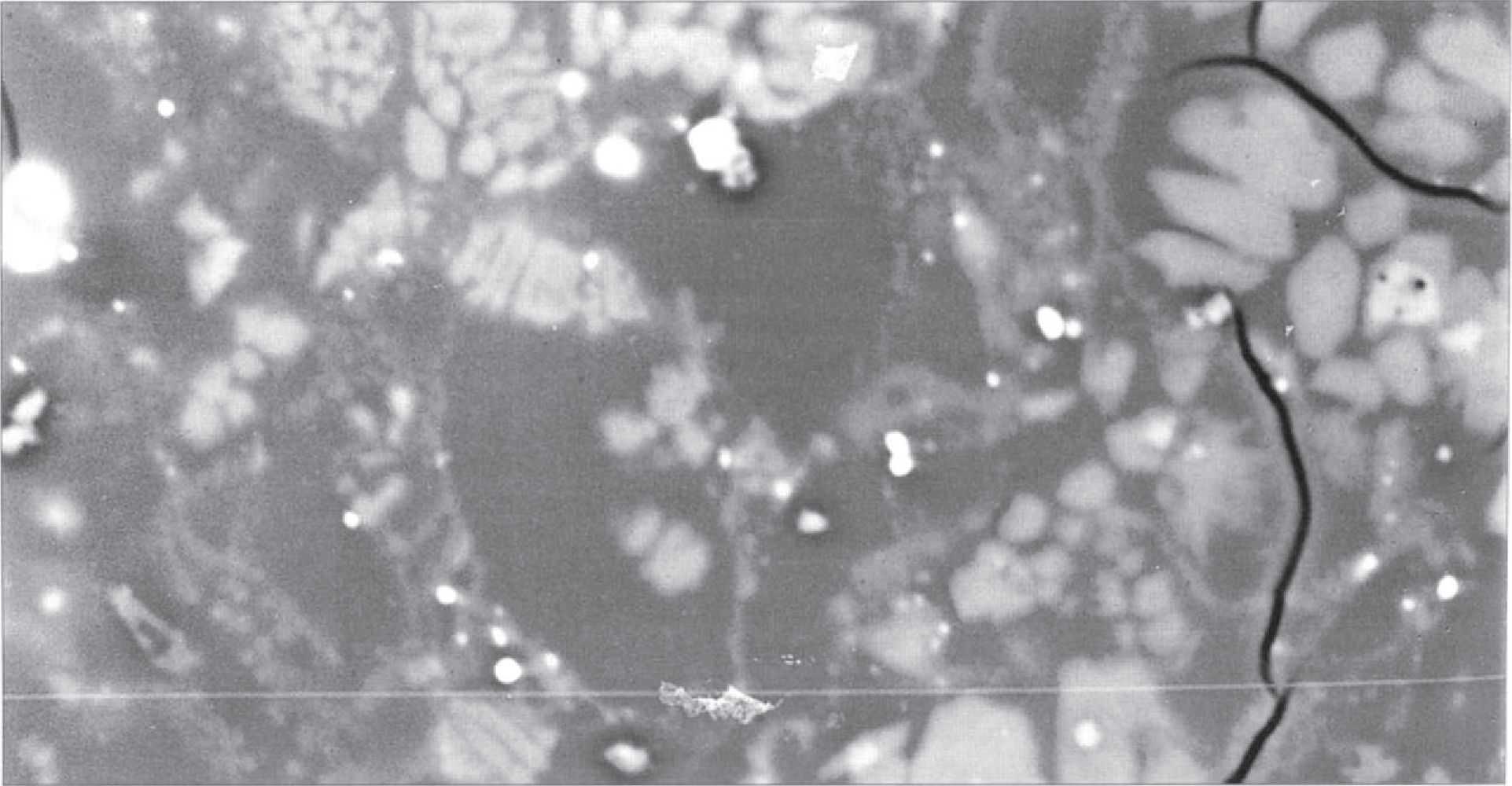 Рис. 3.6.3. Изображение поверхности лейцитной керамики в растровом электронном микроскопе. Серые участки — полееошпатное стекло, а более светлые — кристаллы лейцита