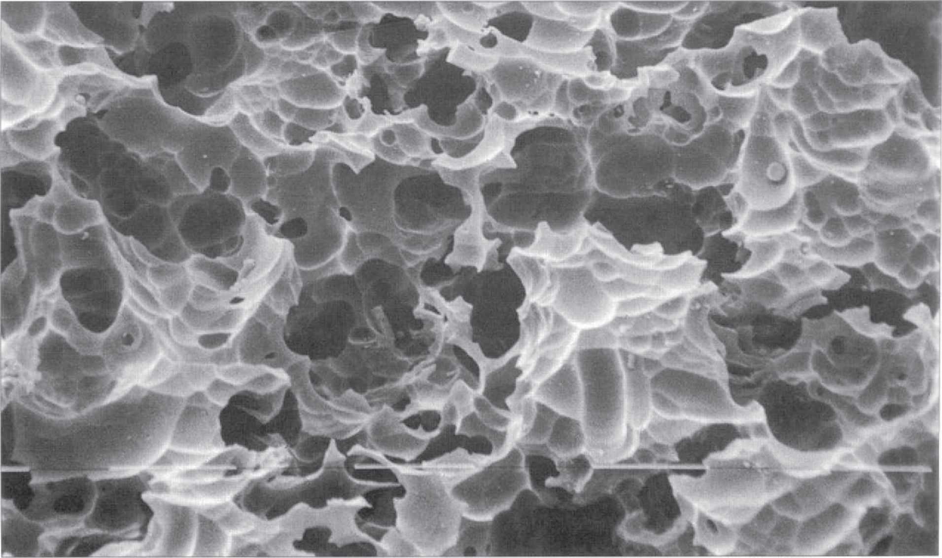Внутренняя поверхность керамических протезов, при их изготовлении на огнеупорных зуботехнических штампиках, обладает определенной шероховатостью после пескоструйной обработки, применяемой для удаления остатков огнеупорного формовочного материала. Травление фтористоводородной кислотой этой керамической поверхности, особенно такой как полевошпатная керамика, упрочненная лейцитом, еще более усиливает шероховатость поверхности за счет избирательного протравливания либо кристаллической фазы лейцита, либо фазы полевошпатного стекла. В качестве примера на Рис. 3.6.3 показано изображение неоднородной поверхности упрочненной лейцитом керамики, полученное с помощью метода обратного рассеяния под растровым электронным микроскопом. Такую гетерогенность поверхности можно использовать путем избирательного травления того или другого компонента керамики фтористоводородной кислотой. Результат этого травления представлен на Рис. 3.6.4, демонстрирующим большие возможности для микромеханического соединения поверхности керамики в результате удаления фазы лейцита. Полимер способен проникать в эти микроскопические пространства и создавать очень прочное соединение.