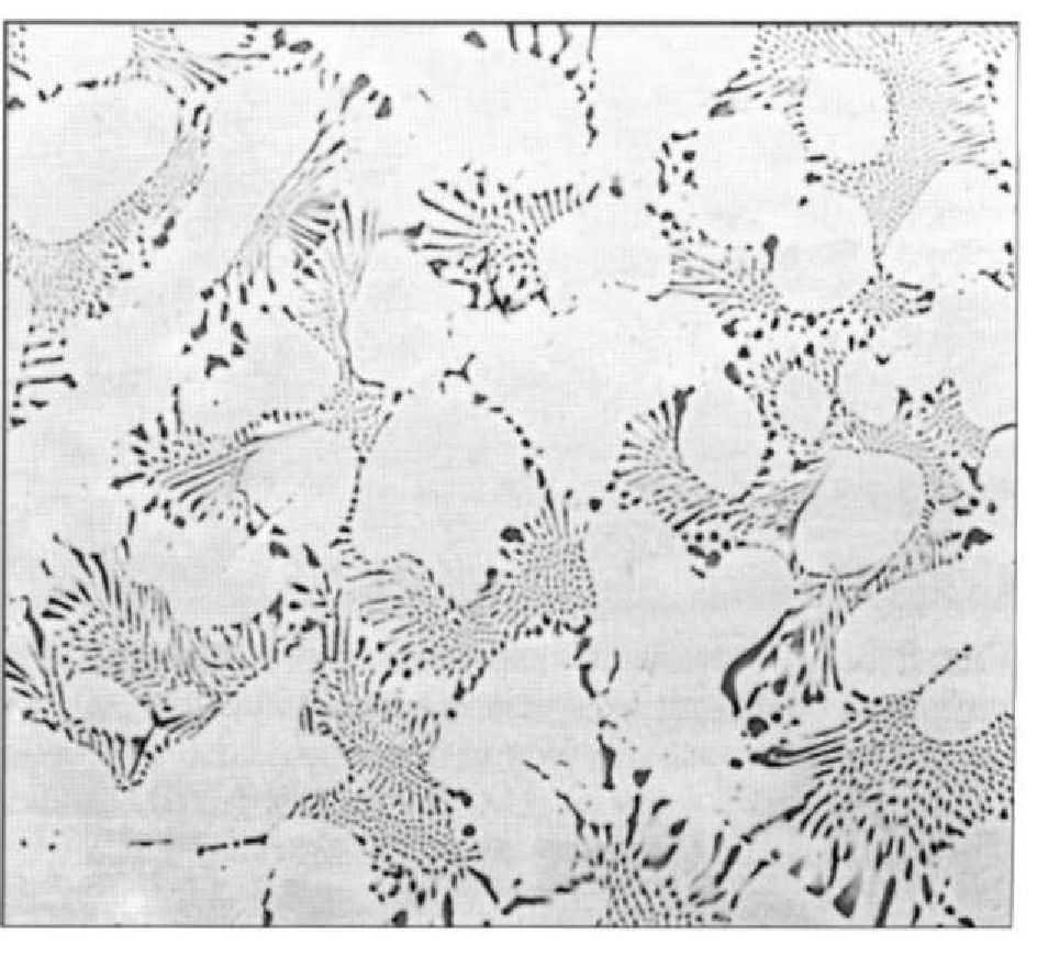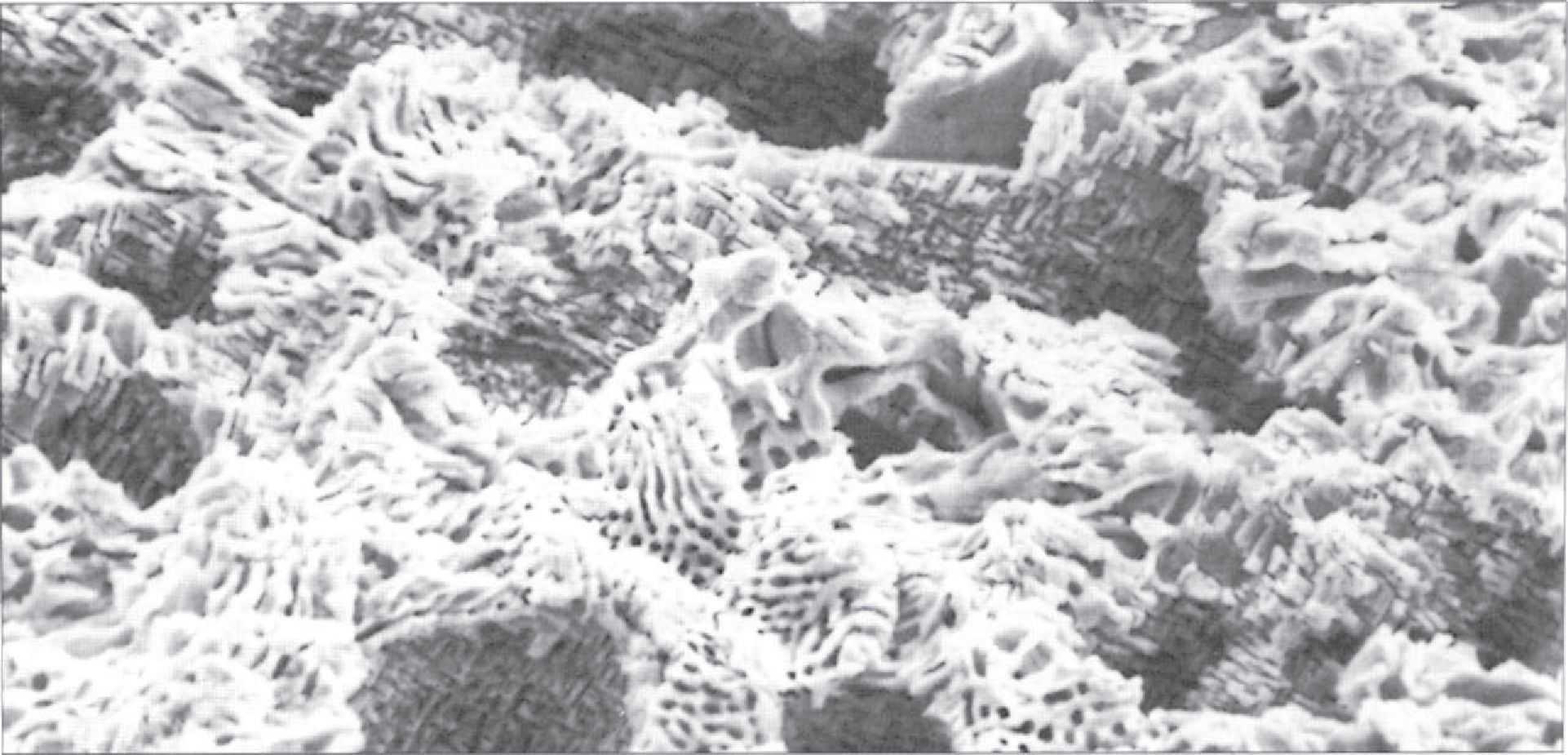 Недостатки, связанные с нанесением полимерного материала на металлическую поверхность с макроретенционными захватами, частично были преодолены в начале 80-х годов, когда был разработан оригинальный метод обработки Ni-Cr сплавов. При использовании этого метода вся контактная поверхность металлического каркаса в результате электролитической обработки или травления кислотным гелем могла обеспечивать микромеханическое соединение с полимерным материалом для фиксации. Причем подобной обработке поддавались только Ni-Cr и Со-Сг сплавы, имеющие эвтектическую структуру (Рис. 3.6.7), хотя для металлокерамических протезов чаще применяют Ni-Cr, чем Со-Сг из-за большей сложности наплавления керамики на последний. В результате процесса травления сплава удаляется одна из фаз, и на его поверхности образуется множество углублений и бороздок (Рис. 3.6.8), которые обеспечивают прочное микромеханическое соединение с композитным фиксирующим материалом. Композитный материал соединяет всю площадь металлического каркаса с протравленной эмалью, и металл