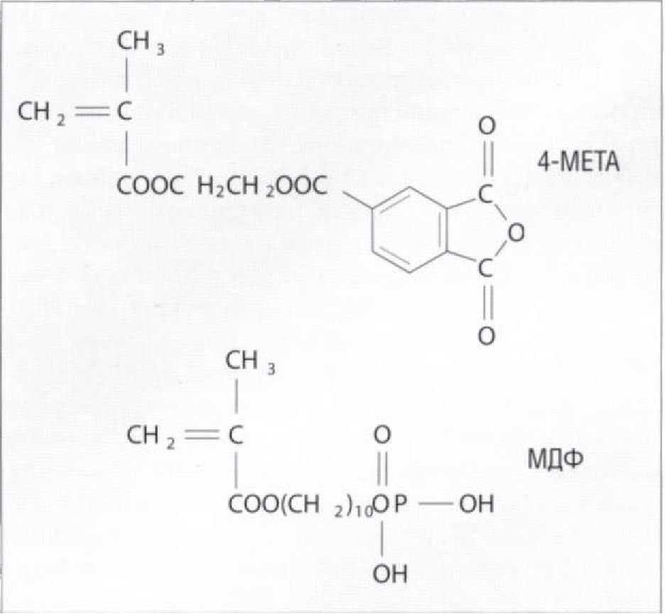 модействию с подготовленным для этого металлом. Для того, чтобы отличить эти модификации от традиционных материалов на основе Бис-ГМА, полимерные композиты для фиксации обычно называют полимерными материалами для фиксации с химической адгезией. В одной из таких систем активной составляющей является карбоновый мономер 4-МЕТА (4-метакрилоксиэтилтримеллитатовый ангидрид), выпускается под названием С&В Superbond (Sun Medical Co., Шига, Япония). Другая фиксирующая пластмасса содержит модифицированный фосфатный мономер типа МДФ (метакрилоксиэтиленфенилфосфат). Примером этого вида полимерного материала для фиксации с химической адгезией является материал Panavia 21 (Kuraray, Осака, Япония). Адгезия полимерных материалов к металлам обеспечивается здесь высокой степенью химического сродства производных карбоксильной или фосфорной кислоты в модифицированных мономерах к оксидам металлов на поверхности неблагородных сплавов (Рис. 3.6.10).