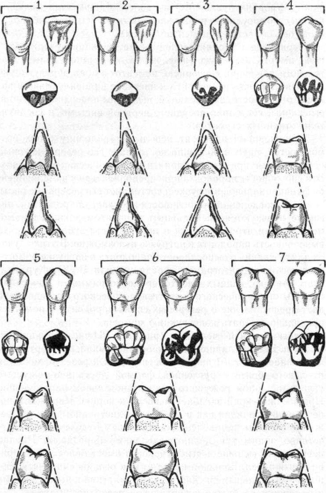 Зубы верхней челюсти (рис. 5). Центральный резец. Вестибулярная поверхность широкая, по очертаниям напоминает ноготь 1 пальца кисти. Правый резец отличается от левого более округленной формой дистально-режущего угла и наклоном режущего края в дистальном направлении. Пришеечный край загибается вверх к корню. Наружная поверхность выпуклая как в медиально-дистальном, так и в режуще-шеечном направлениях. В нижнем отделе коронки отчетливо видны три доли, разделенные бороздами. Небная поверхность меньше вестибулярной и имеет более узкий пришеечный отдел. Большая небная ямка ограничена выступающими медиальным и дистальным маргинальными краями и расположена ближе к дистальной поверхности зуба.