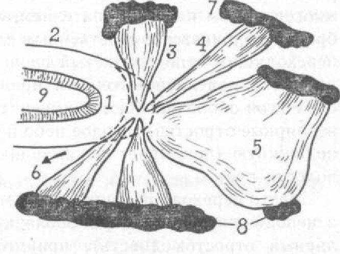 1 ■ круговая мышца рта; 2 — мышца, поднимающая аерчнюда | убу; 3 — мышца клыконан; 4 скуловая мышця; 5 — щечная чышиа: 6 — треугольная мышца. 7 — скуловая кость; в — нижнечелюетчая кость: 9 — ротовая щель.