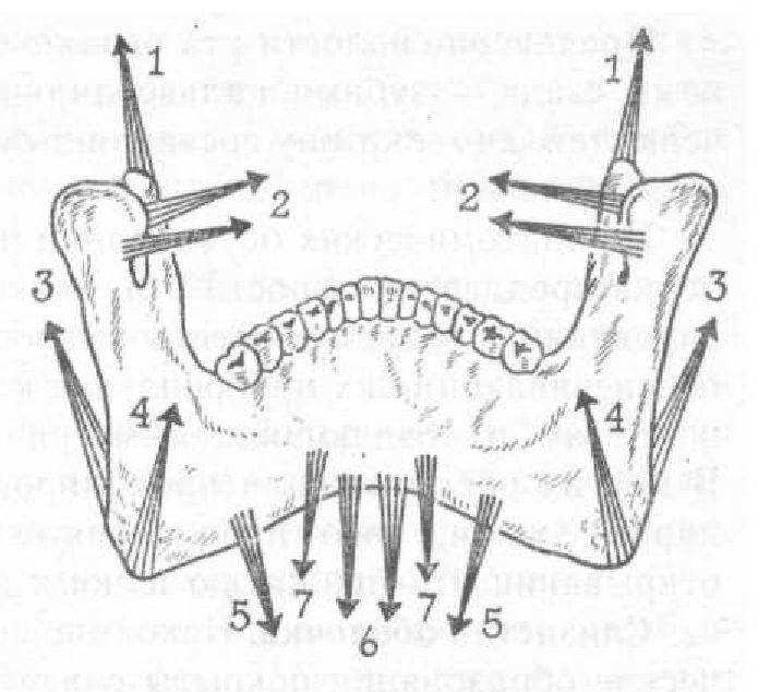13. Направление тяги мышц, прикрепляющихся к нижней челюсти {по М. В. Мухину):.