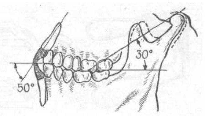 и бокового резцового пути 120°. В заднем отделе рама изогнута под углом 110° соответственно углу нижней челюсти. Верхние концы нижней рамы заканчиваются суставными сочленовны-.