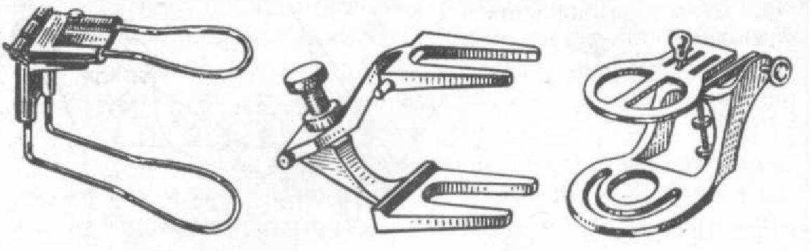 Окклюдаторы (рис. 16) состоят из двух проволочных или литых рам. соединенных между собой шарнирно.. Нижняя рама изогнута под углом 100—110° и имитирует угол и ветвь нижней челюсти. В заднем отделе рамы имеется площадка для упора штифта, удерживающего высоту прикуса. Верхняя рама расположена в горизонтальной плоскости и имеет вертикальный штифт, упирающийся в площадку на нижней раме.