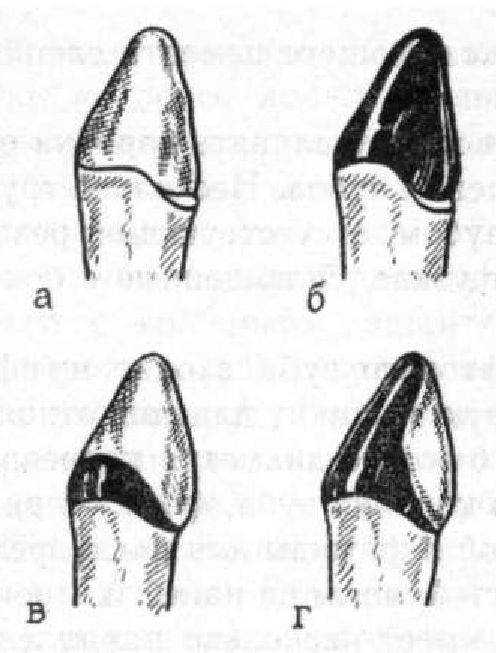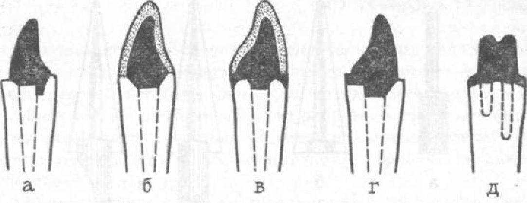 а, 6— культя прилетает к центральной части поверхности кормя: в, л — культя прилегает ко всей поверхности корни; г — культя прилегает и центральной и оральной поверхностям корня