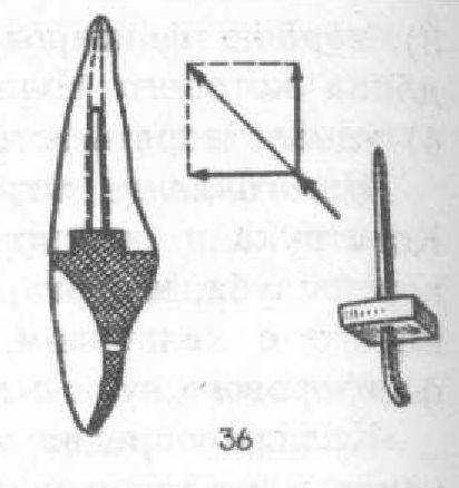 Изготовление штифтового зуба по Ильиной-Маркосян (рис. 36). Особенностью конструкции штифтового зуба, предложенной Д. В. Ильиной-Маркосян,является питая вкладка кубической формы толщиной 2—3 мм, расположенная в устье канала корня и выполняющая роль фиксатора (для зуба) и амортизатора (для корня). Вкладка удерживается проволочным штифтом длиной от I до 1,25 см, способным лучше сопротивляться приложенным усилиям, чем литой штифт, вследствие его упругости. Толщина штифта в наиболее широкой части составляет 1,5—1,75 мм. Постепенно уменьшаясь в диаметре, он не полностью выполняет просвет канала корня, оставляя место для цемента, и тем самым освобождает стенки канала от вредных напряжений. Корень изолирован от проникновения слюны литой защитной пластинкой и вкладкой.