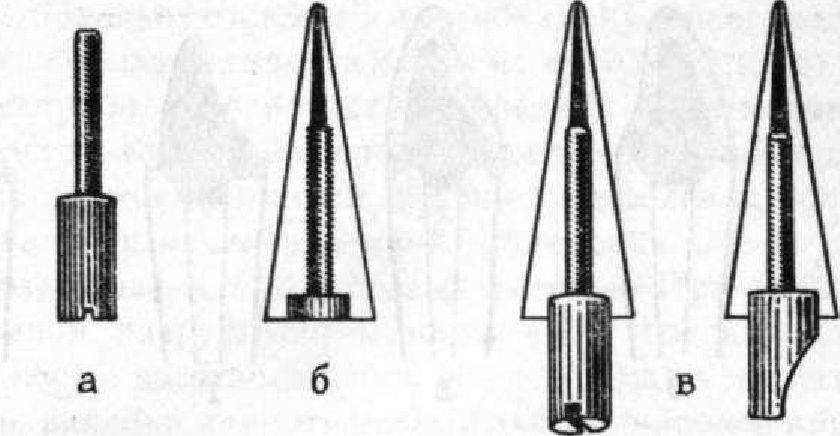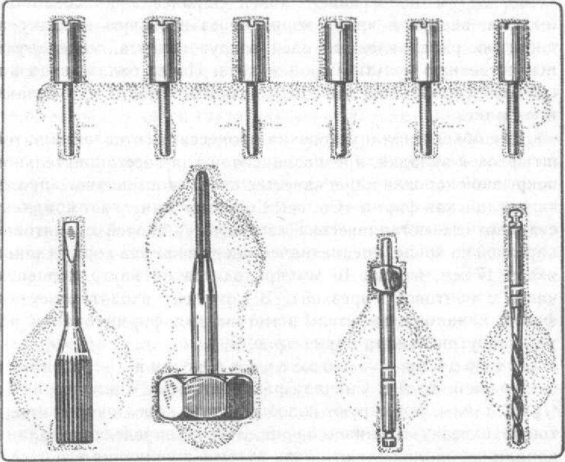 Для облегчения и ускорения процесса изготовления литой штифтовой вкладки, предназначенной для восстановительной покрывной коронки или в качестве опоры мостовидного протеза, английская фирма «Cottrell Compani» выпускает комплект стандартных металлических заготовок — якорей с винтовой нарезкой на конце, предназначенных для канала корня (длина якоря 17 мм, из них 10 мм приходится на внутрикорневую часть с винтовой нарезкой). В комплект входят отвертка, фреза, каналорасширитель и метчик для формирования нарезки внутри канала корня (рис. 39).