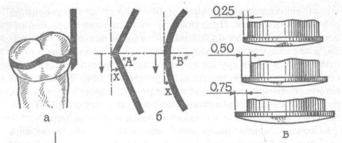 С. С. Березовский в 1978 г. предложил упрощенный метод определения среднего наклона длинных осей опорных зубов путем нахождения биссектрисы угла. Для этого модель^укрепляют на столике параллелометра произвольно, а затем, изменяя ее наклон, добиваются параллельности вертикальной оси зуба стержню прибора. Подведя стержень вплотную к зубу и пользуясь им как линейкой, наносят на боковой поверхности модели линию. Таким же образом поступают и с другим опорным зубом, но его наклон переводят к линии наклона первого зуба и получают угол, биссектриса которого и будет соответствовать средней величине наклона осей двух зубов в сагиттальной плоскости. Подобным образом поступают и для определения среднего наклона опорных зубов в трансверзальной плоскости.