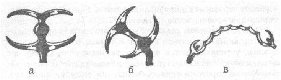 61. Кламмеры Бонвиля (а), Рейхельмана (б) и непрерывный (многозвеньевой) (в).