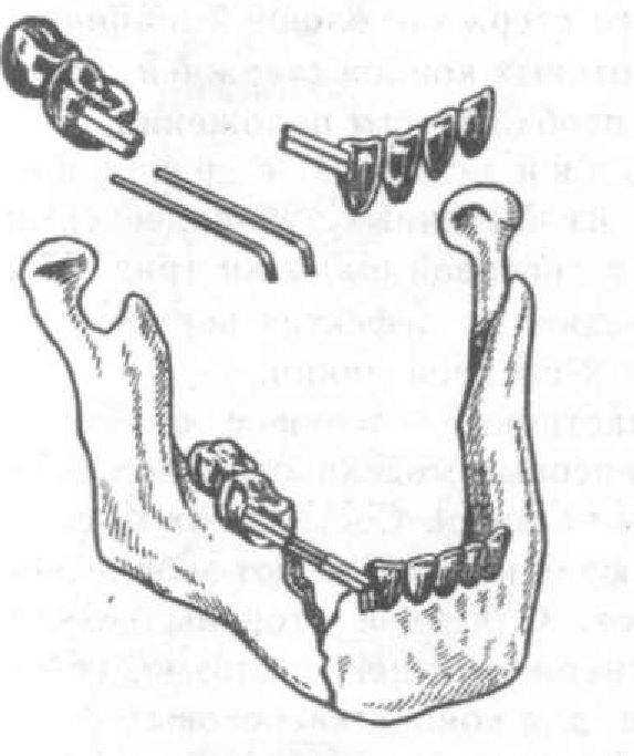 Изготовление. Снимают слепки с отломков челюсти для изготовления коронок. Припасовывают коронки на зубы, снимают слепки с отломков челюсти и с верхней челюсти. Отливают модели, сопоставляют их в положении центральной окклюзии, гипсуют в окклюдатор. Спаивают коронки между собой и припаивают с вестибулярной поверхности коронок верхней и нижней челюстей горизонтальные трубочки четырехугольной или овальной формы. Изготовляют две П-образные скобы, толщиной 2—3 мм соответственно форме втулок. Накладывают аппарат на челюсть, сопоставляют отломки в правильное положение и закрепляют их путем введения скобы.