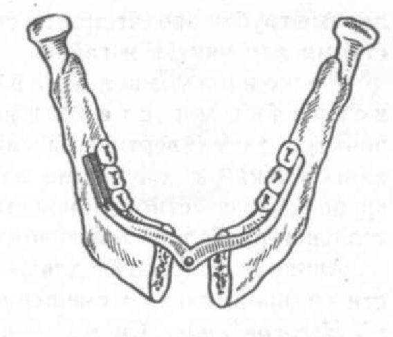 Показание — сложные перемещения отломков нижней челюсти и ограниченная их подвижность, дефект кости в подбородочной области.