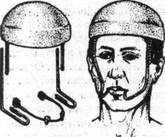. Изготовление. Снимают частичные слепки с отломков верхней челюсти, отливают гипсовые модели, изготовляют коронки На 6 3 13 6 зубы, проверяют коронки rfa опорных зубах, снимают слепки. Отливают модели, изготовляют единую паяную шину и припаивают вестибулярно с обеих сторон плоские трубочки. Изготовляют два стержня — «уса» с уплощенными внутренними концами. Укрепляют шину на опорных зуба*. После этого изготовляют гипсовую шапочку и фиксируют в ней вертикальные стержни. Выгибают стержни соответственно щечной зубной поверхности, выводят их сдеоло углов рта наружу и параллельно окклюзионной плоскости, изгибают против короткого вертикального стержнч головной шапячки...
