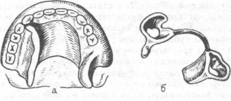 Для предупреждения смещения здоровой половины нижней челюсти в сторону дефекта при моделировании фиксирующей части протеза предусматривают съемную или несъемную наклонную плоскость, прилегающую к щечной поверхности-верхннх боковых зубов (рис. 80Ь.