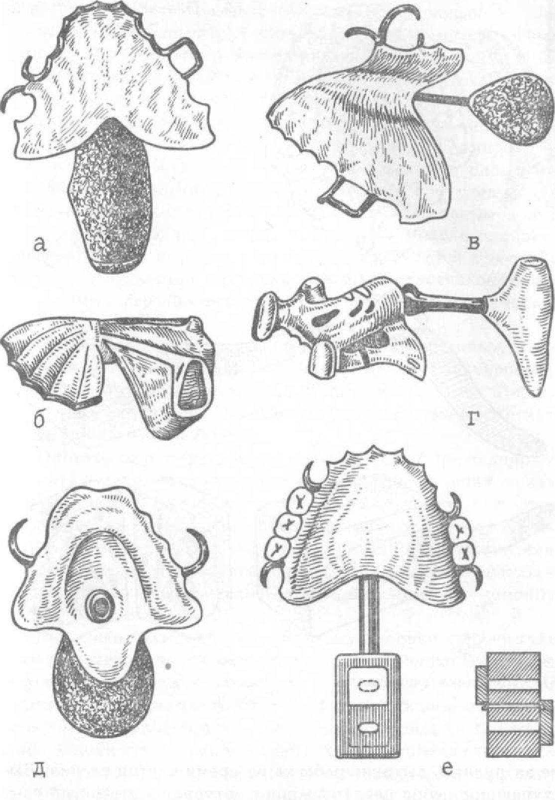 При изолированных дефектах мягкого неба обтуратор состоит из фиксирующей части (располагающейся в пределах твердого неба) и обтурируюшей (закрывающей дефект мягкого неба). Эти части могут соединяться между собой или жестко (обтуратор Сюерсена) — при отсутствии мышц мягкого неба, их рубцовом изменении, или подвижно с помощью шарнира, пружины, эластической пластмассы (обтураторы Шильтского, Померанцевой — Урбанской, Ильнной-Маркосян) — при подвижности мышц мягкого неба (рис. 85).