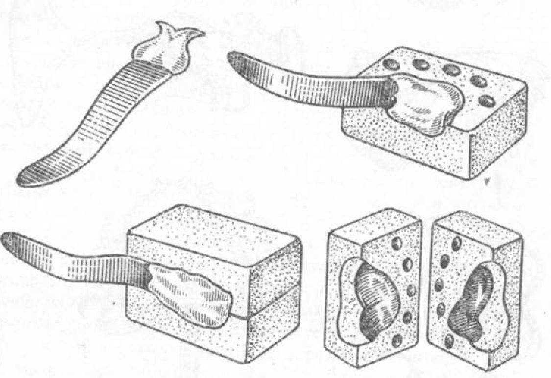 Удалив излишки слепочной массы, слепок гипсуют в кювету носовой поверхностью в гипс, оставляя свободной поверхность обращенную в полость рта. После выплавления термопластической массы форму заполняют воском и тщательно моделируют форму обтуратора, после чего отливают вторую часть кюветы и заменяют воск пластмассой.