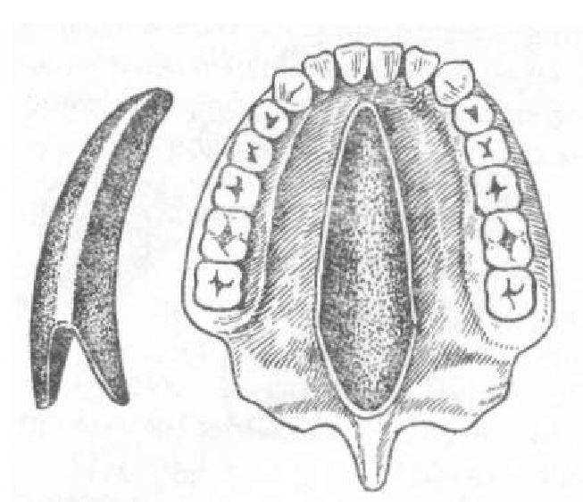 Изготовление защитной небной пластинки. После операции по поводу врожденных расщелин неба возникает необходимость защиты линии шва от загрязнений, удержания тампонов и лоскутов неба в новом положении, формирования небного свода. Для этого используют защитную пластинку, техника изготовления которой заключается в следующем. Снимают слепок ложкой с удлиненным дистальным краем, доходящим до задней стенки глотки. На модели заливают гипсом область дефекта, гравируют шейки зубов с вестибулярной поверхности и покрывают восковой пластинкой толщиной 1,5 мм с перекрытием всех зубов до шеек. Воск заменяют пластмассой.