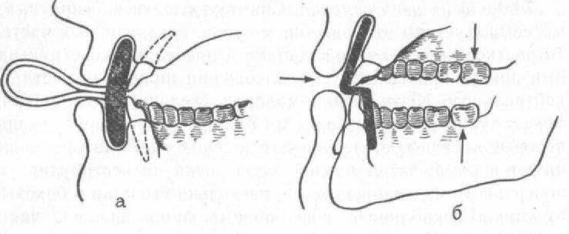 При попытке сместить нижнюю челюсть назад (в исходное положение) давление, воспринимаемое верхними передними зубами и нижней челюстью, способствует смещению верхних зубов орально, а нижнюю челюсть стимулирует к росту. Контакт передних зубов с пластинкой и разобщение боковых зубов способствуют зубоальвеолярному удлинению премоляров н моляров и уменьшению глубины перекрытия.