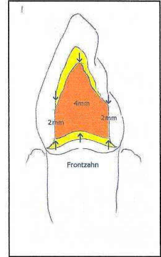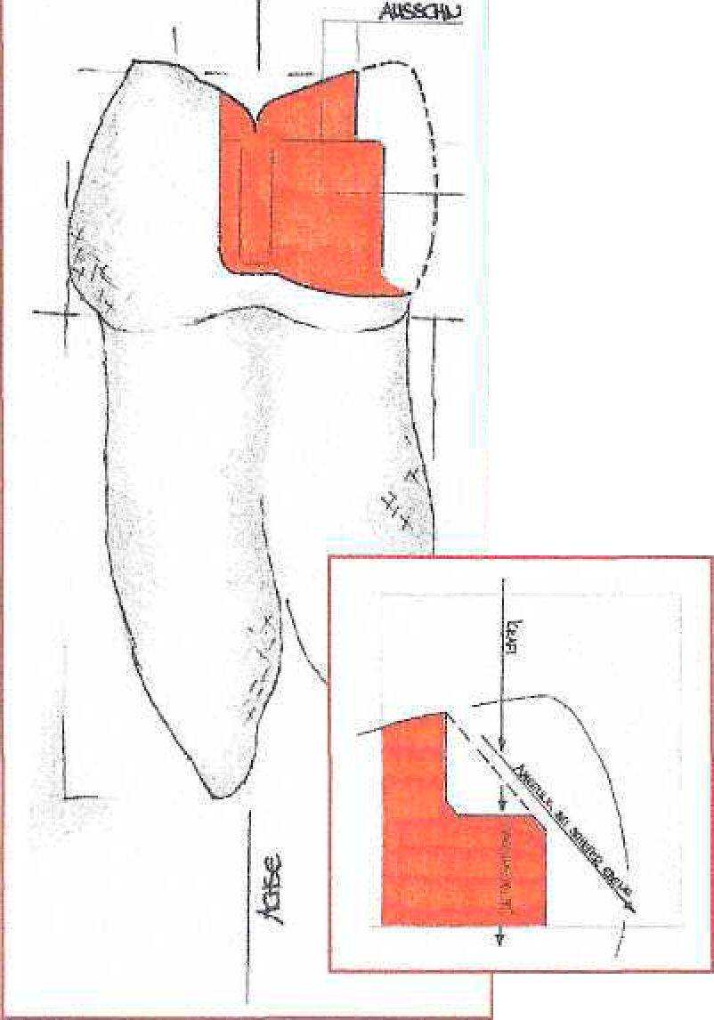 Она делается предпочтительно овальной формы чтобы избежать перфорацию зуба. Также она не должна превышать горизонтальную глубину половины толщины фрезы. Если это случится, то получается отфрезеровонный жёлоб. Так как у нашей фрезы из твёрдого метала все ножи сбегаются на фронтальной части, она не может, если она там прилегает, вертикально фрезеровать. Резинкой для полировки убирают со ступеньки столько чтобы фронтальная часть фрезы была опять свободной.