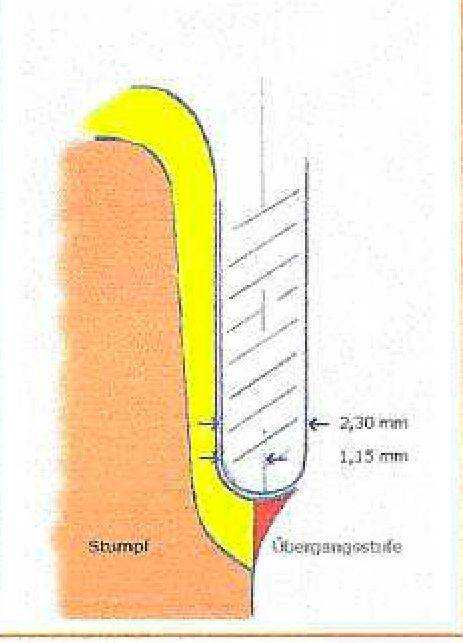 Секундарная часть будет значительно выдвигаться в оральную сторону, что будет создаваться не только нефизиологическая и неосевая нагрузка а также высокая нагрузка на структуру сплава. (Износ материала) Находятся ли уступы (плечо,ступенька) в пришеечной или оклюзионной области или посередине высоты, не имеет никакого влияния на функцию, так как речь идёт о точном выполнении формо-силового соединения между примарной и секундарной коронками, которые составляют в конечной позиции одну часть.