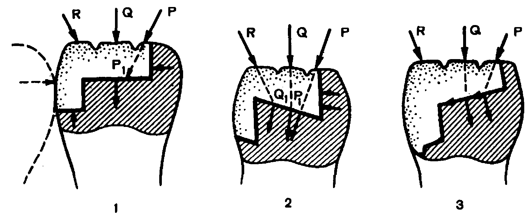 Сопротивление вертикально направленным силам, действующим на вкладку, оказывают основания полости (дно и прншеечная стенка). Наибольшее сопротивление этим силам обеспечивает основание полости, сформированное под прямым углом к оси зуба. Косо направленное дно и прншеечная стенка значительно улучшают устойчивость вкладки, если скошены к центру зуба. Если дно или прншеечная стенка скошена кнаружн, то создается наклонная плоскость, по которой вкладка может сместиться.